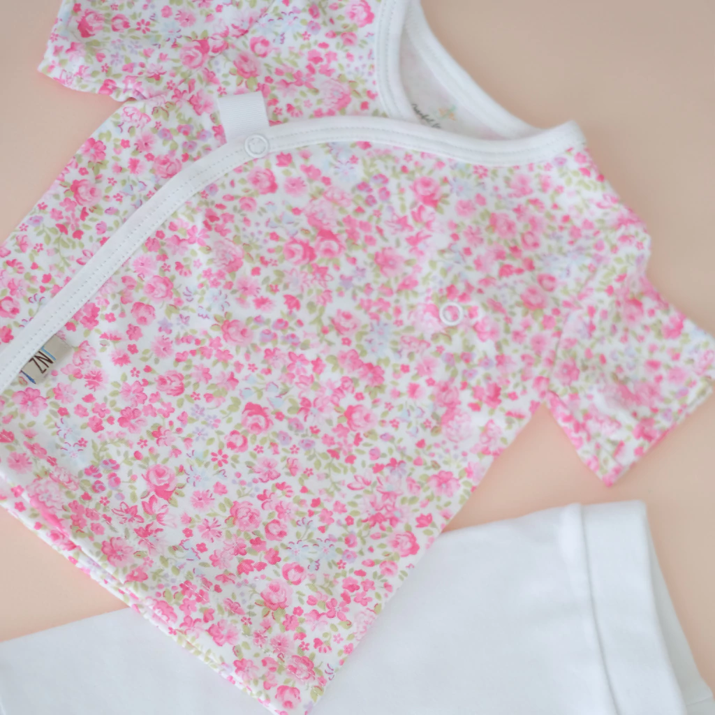 Batita mangas cortas estampado motivos florales cruzada al frente y cierre con dos broches