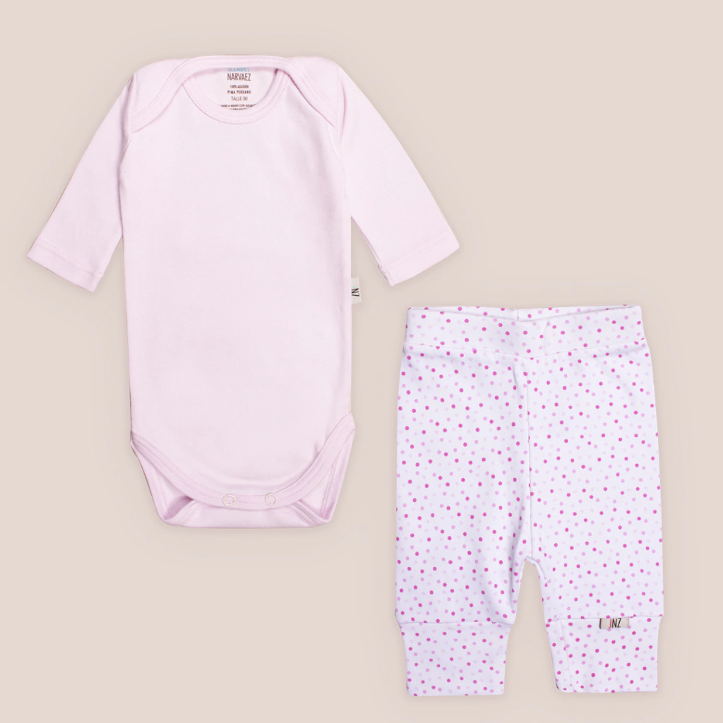 1.- Un body de manga larga pima rosa liso de cuello americano con cierre de broches metálicos en la entrepierna.