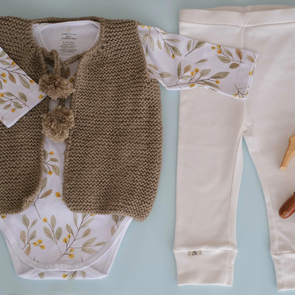 1.- Un body de manga larga estampado Paris, pequenas hojas en tonos tierra con predominio del verde seco y frutos en color maiz, cierre en entrepierna con broches